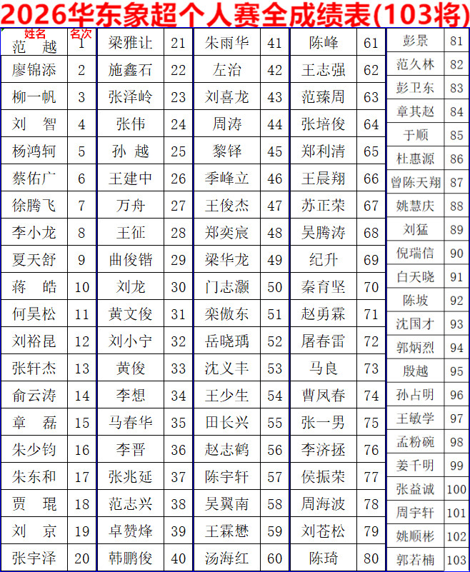 范越、夏天舒、何昊松、张轩杰、俞云涛、章磊、朱东和、施鑫石、王建中、万舟、王征、曲俊锴、李想、马春华、卓赞烽、朱雨华、季峰立、王俊杰、郑奕宸、门志灏,获华东地区棋手排名榜前二十名,取得年度象超总决赛的席位。