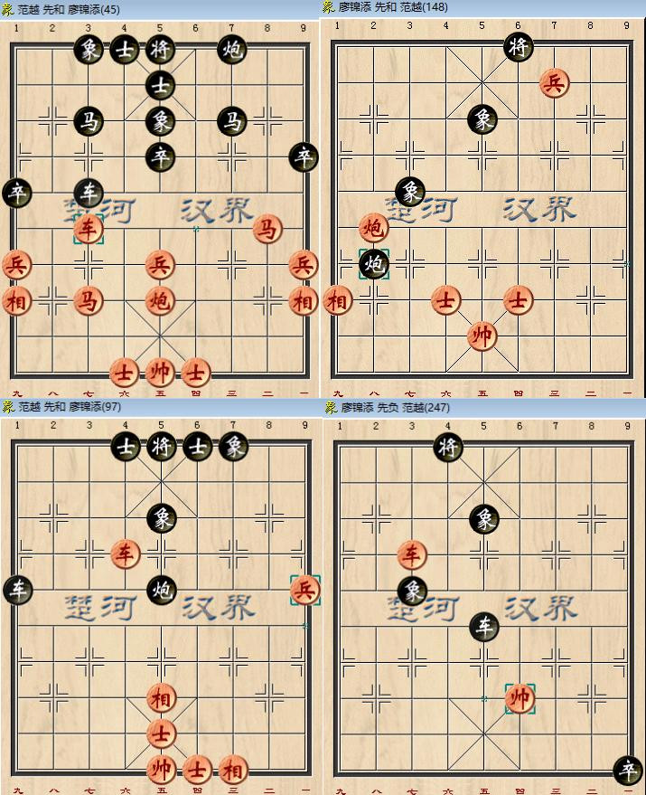 首局中,范越执先手,跳边马怪阵,45手打和,换先加赛超快棋,廖锦添执红棋多双兵,占优中,范越顽强防守,两人鏖斗148手,红兵换黑双士,至炮兵对炮双象成平。