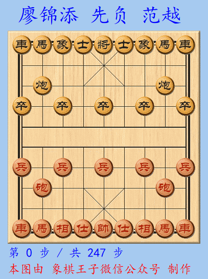 加赛超快棋第三局,总第四盘,廖锦添执红棋,摆下中炮阵,先冲七兵,显示势在必得之态,范越应以左三步虎。